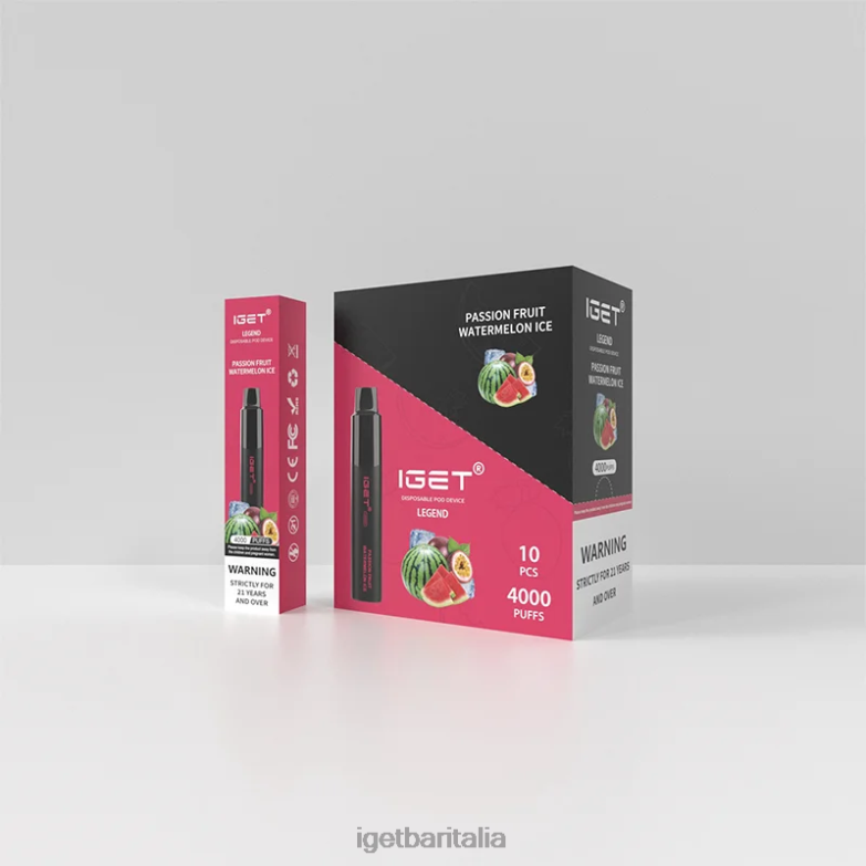 iget legend passion fruit watermelon ice è una fusione allettante di frutto della passione tropicale , anguria succosa e una sensazione di ghiaccio rinfrescante, offrendo un’esperienza di svapo rinfrescante e soddisfacente.
